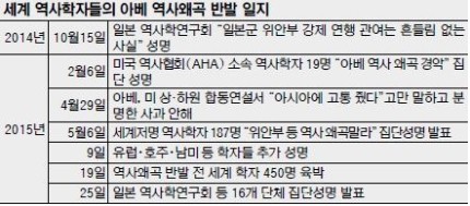 아베 총리의 미 의회 연설 이후 위안부 왜곡을 비판하는 성명에 참여한 학자들은 미국, 유럽, 호주, 남미 등 전 세계적으로 확산됐다. 지난 5월 6일 187명의 역사학자들이 첫 집단성명을 낸 이후 지난 19일까지 450여명으로 늘어났다. 이번에 가해국인 일본의 학자들까지 가세하면서 아베 정부의 입지는 더욱 좁아졌다.