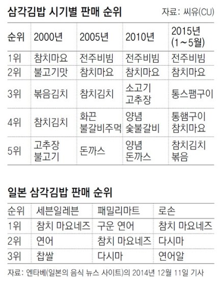 참치마요삼각김밥 정도다. 일본의 음식 뉴스 사이트인 엔타베의 지난해 12월 발표를 보면 일본의 3대 편의점 업체-세븐일레븐 패밀리마트 로손-의 삼각김밥 판매 순위에서 참치마요는 모두 1위 또는 2위였다.