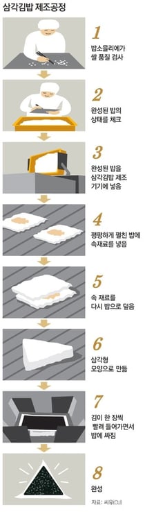 삼각김밥의 속 재료다. 최근에는 밥도 다양해지고 있다. 과거에는 흰쌀밥뿐이었다면 요즘에는 흑미나 현미를 쓰기도 한다. 밥의 품질을 전문적으로 관리하는 사람도 있다. CU에는 밥 소믈리에 2명이 삼각김밥에 들어가는 쌀을 꼼꼼히 살핀다. 수분 함량 등이 주요 점검 대상이다. 갓 도정한 쌀을