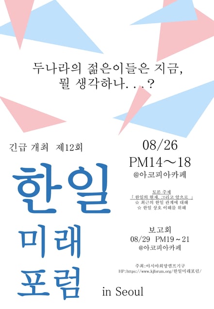 이 포럼은 일본인과 한국인의 청소년에 의한 새로운 한일 관계의 구축을 목표로 한일의 미래에 대해 논의하고 창조를 해 나가기위한 것입니다.