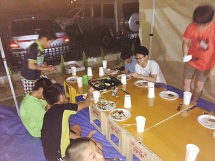 내가 머물게 된 그곳은 마당이 넓은 3층집이었다. 개 슈나우저 두 마리가 있었고 심지어 수영장까지 있었다. 낮에 아이들이 수영복을 입고 마당에 있는 수영장에서 놀았다. 방에서 각자 놀다보니 집에 손님들이 오기 시작했다. 그 중에는 우연히도 캠프 인솔 선생님도 계셨다. 모이는 이유를 알 수 없어 선생님께 여쭤보니 선생님도 모른다고 하셨다. 나중에 알고보니 우리가 온 것을 축하하기 위해 마을에서 알고 지내는 모든 다문화 가정 사람들을 부르신 것 같았다. 국적도 매우 다양했다. 스페인, 중국, 한국, 미국 등 일본에서 보기 어려운 국적이 많이 보였다. 저녁이 되자 마당에서 바베큐 파티를 했다. 삼겹살과 소시지, 스시를 먹었는데, 모기가 계속 들러붙어서 즐거운 분위기에 집중하기가 어려웠다.
