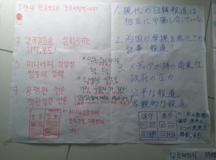 미디어문제원인대책 등을 완성한 후 한 팀의 발표자만 남고 나머지 팀원은 다른 팀에 가서 발표자의 발표를 듣고 종이에 코멘트를 남기는 독특한 형식이 있었는데, 우리 팀에 남긴 일본 학생들 중 날카로운 일본어로 비판을 하는 사람들도 있었다. 같은 비판을 일본학생들과 한국학생들이 남겨 주었는데, 한국학생들은 오히려 조금 유한 방식으로 비판을 했다. 예를 들면 어떠한 점은 괜찮았는데 그 점에 대해서 이런 문제가 있다. 식이였다. 이두 활동을 통해 새로 알게 된 점은 일본인은 얼굴을 보고 말할 때보다,글로 코멘트를 할 때 더욱 잘 비판적으로 얘기할 수 있음 이였다.