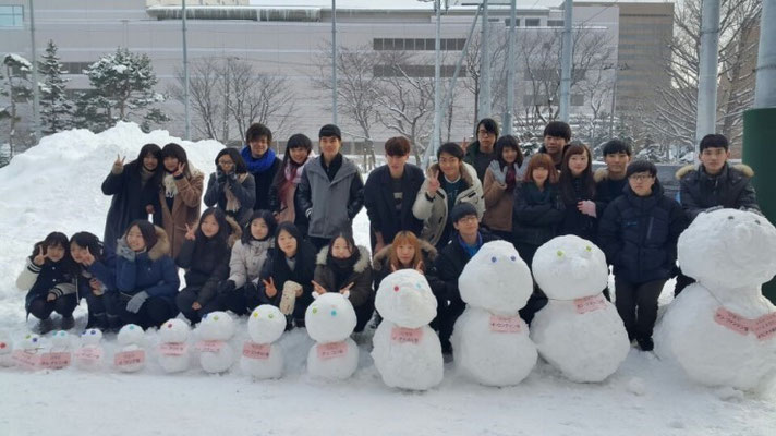 그날 오후에 제설봉사활동이 예정되어 있었으나 눈이 작년에 비해 적게 온 관계로 협동하여 눈사람을 만드는 것으로 대체했습니다. 오오도리 고등학교 학생들과 눈밭에서 달리기 시합을 한 것과 눈사람을 만드는 일은 정말 즐거웠습니다!
