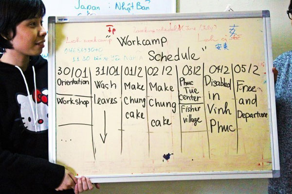워크캠프의 본격적인 일정이 시작되기 전, 대략 6일동안 머무를 방을 배정 받았다. 방은 2층 침대형태였고, 스티로폼 위에 침대시트만 있는 정도였다. 다행히 1월 말의 하노이의 날씨는 초겨울 날씨였기에 한국에서부터 걱정하던 모기는 많이 없었지만 침낭 하나로 버티기에는 조금 추웠다. 한국에서는 봄, 가을 날씨 정도로 생각하고 갔기에 얇은 옷들이 조금 걱정되었지만 지내는 동안 점차 적응해서인지 괜찮았다. 짐 정리가 끝나갈 때쯤, 일정이 본격적으로 시작되었다.
