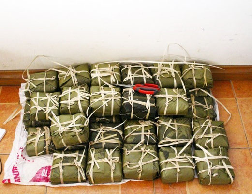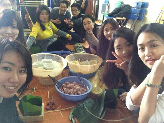 2016.01.31 본격적으로 새해 Chung Cake 만들기에 돌입했다. 제일 첫 단계로는 Chung Cake를 위한 잎을 씻는 일이었다. 아침에 일어났을 때 발견한 엄청난 크기의 잎과 그 잎들의 량. 바나나 잎이라고 들었는데 한국에서는 보기 힘든 크기여서 입이 벌어질 정도 였다. 잎은 조금이라도 세게 씻으면 찢어지기 때문에 조심조심 애기 씻기듯이 2번씩 씻어야 했다. 수압이 그렇게 쌘 편이 아니었기에 물을 받아 씻는 데는 시간이 좀 걸렸다. 생각보다 역할 분담이 잘 되었고, 속력을 빠르게 움직여서 해서 그런지 잎들을 씻고 10개씩 모은후 묶고 말린 과정을 거친 후 바로 Chung Cake 만들기를 시작했다. Chung Cake 만들기의 경우, 끈 두 개를 먼저 밑에 깔고, 정사각형 틀을 위에 놓는다. 그리고 일정한 크기로 잘린 잎을 종이 접기 하듯이 접은 후 틀에 끼우고, 그 속에 쌀, 콩, 후추에 절인 돼지고기, 콩, 쌀 순으로 넣는다. 그 후 선물 포장하듯이 접은 후 줄로 튼튼하게 묶으면 끝! 과정은 그렇게 어렵지 않았지만 총 180개를 만들어야 하는 것이 쉬운 일이 아니었다. 만들어진 Chung Cake이 찌는 과정에 터지거나 부서지면 쓸 수가 없기 때문에 더욱 꼼꼼하게 만들어야 했다. 첫날 만들었던 케이크의 수는 대략 50개 이상! 생각보다 많이 만들어서 빨리 끝나겠는데? 라는 나의 생각을 비웃기라도 하듯이,, 다음날 10정도가 부서졌다고 했다. 같이 만들었던 멤버들은 좌절했지만 더욱 힘내서 다시 만들기 시작했다.