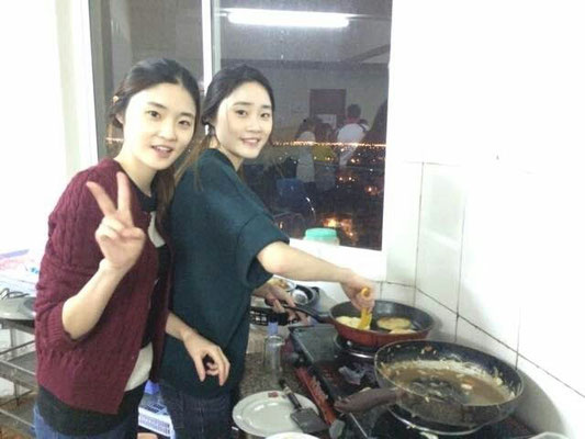 Chung Cake을 만들 던 중 현지 봉사자들이 한국음식을 먹어 보고 싶다는 말에 우린 만들어 주겠다는 말을 했다. 한국음식만으로는 20인분을 만들기 힘들 것 같아서 일본인 친구 3명과 함께 한국음식과 일본음식을 같이 만들었다. 일본친구들의 경우, 일본식 카레와 밥을 만들었고 우리는 한국의 대표 불고기와 겨울 간식 호떡을 만들었다. 불고기의 경우 불고기 소스를 한국에서 가져온 동생 덕분에 가능했었다. 첫날 방문한 전통시장에서 쇠고기와 야채를 산 후 조리를 시작했다. 그런데 요리를 시작하고 야채를 손질 한 후 문제가 생겼다. 쇠고기의 핏물을 뺀다며 물에 넣어놓은 쇠고기를 빼보니 아주머니가 힘줄 제거를 전.혀. 하지 않으셨던 것이다. 그리하여 우린 한국에서도 해보지 않은 힘줄 제거를 하기 위해 4명에서 칼과 가위를 들고 한 시간 삼십분 동안이나 2kg의 고기와 사투를 벌였다. 겉에 붙은 힘줄과 속에 숨어 있는 힘줄까지 하나하나 제거하고 나니 어느새 우린 본격적인 요리가 시작 되기도 전 지치고 말았다. 그래도 기다리는 친구들을 위해서 불고기를 조리하고 호떡도 같이 반죽하기 시작했다. 호떡을 반죽하고 모양을 만들기 시작하자 친구들은 하나 둘씩 모이기 시작했고, 처음 보는 호떡의 모양에 호기심을 가지기 시작했다. 혹시나 하여 만들어 볼래? 라는 말해 전부 나서서 만들기 시작했다. 중국 친구들은 중국식 만두 빚듯이 하면 된다는 말에 하나 둘씩 만들더니 굉장히 완벽한 모양으로 완성시켰었다. 나의 담당은 만들어진 호떡을 구워내는 일이었는데 호떡을 누를 만한 기구가 없어 그냥 유리컵으로 눌러 모양을 만들었다. 시식용을 권한 호떡 하나는 인기 대박. 먹는 사람 마다 맛있다며 허겁지겁 먹는 모습에 뿌듯하고 힘들지만 더 만들어 주고 싶었다. 고기의 힘줄 제거 때문에 저녁시간이 지연되었지만 계속해서 맛있다며 먹어주는 다른 친구들 덕분에 만든 사람으로서 기운이 났다. 만약 누군가 베트남에 또 다른 워크캠프를 온다면 호떡은 강추! 누구든지 관심을 가지고 맜있다며 먹었던 음식이라 가지고 가는 보람이 있다.
