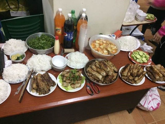 숙소로 돌아와 스프링롤 만들기를 시작했다. 현지 봉사자의 도움 요청에 얼른 달려나가 할 수 있는 야채 손질부터 시작했다. 양파, 감자, 고추 등등 다양한 채소로 롤의 안에 들어가는 소를 만들고 라이스페이퍼로 롤 형태로 말아가며 하나 둘씩 완성한 후 기름에 튀겨 내면 끝! 재료손질을 하며 느낌 점으로는 베트남도 남과 북의 생활양식이 다르다는 것을 마늘 까기 방식으로 알았다. 내가 방문한 하노이는 북쪽이었기에 음식을 자를 때 대부분 슬라이스를 하는 형태로 손질하였고, 남쪽의 경우 마늘의 껍질을 벗기면서 깎는 형식이라고 한다. 여러 사람의 손을 걸쳐 완성한 스프링롤은 야채가 듬뿍 들어간 오렌지색 특제 소스와 소면과 함께 담가서 먹으면 된다. 기름에 오래 튀겨진 음식이라 많이 느끼하진 않을까 라는 생각을 했는데, 맛있고 배도 든든했다.