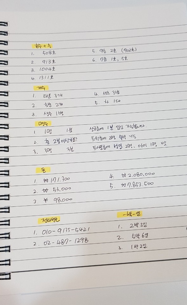 위 사진과 같이 호텔 내에서 특히 많이 사용 될 숫자들에 대해 집중적으로 공부하고