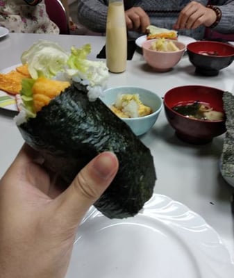 김밥 만들기는 당시 2월 설날이 포함되어있었기 때문에 참가할 수 있었습니다. 일본에서는 설에 김밥을 만들어서 먹는다고 합니다. 교류회관에 도착하니 여러 국적의 외국인 친구들이 있었습니다. 그 친구들과 조를 이루어 같이 협력하고 얘기를 나누면서 즐겁게 만들어 먹었습니다.