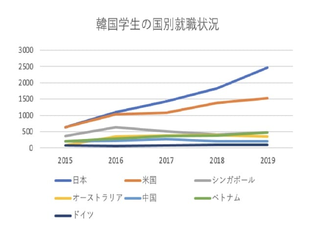 下の韓国学生の国別就職状況のグラフを見て分かるように、ここ近年で日本での就職率が上がっていることが分かる。東京の最低賃金は 1,113 円(2024 年 7 月時点)で、韓国はすべての地域共通で