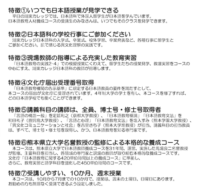 | ▪현지서포트 : 쿠마모토공항 직항 공항마중, 주변시설안내, 첫날등교 동행, 매달1회 일본문화체험, 매주1회 맨투맨 일본어교육(무료), 일본인친구소개. | |