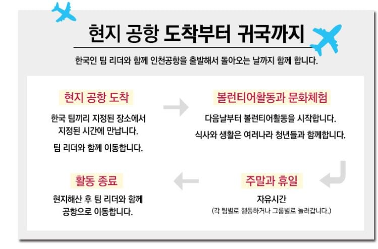 ※ 토요일과 일요일을 제외한 하루 8시간 봉사 인정이고, 출국일과 귀국일도 하루 8시간 봉사한 것으로 인정합니다.